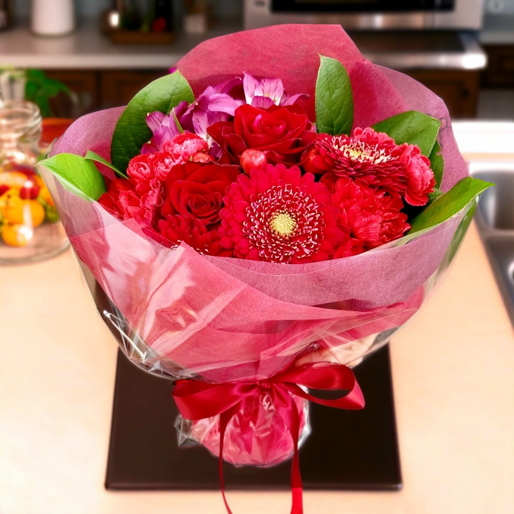 華やかな赤いお花を集めてブーケに仕上げたら、情熱的なフラワーギフトになりました。